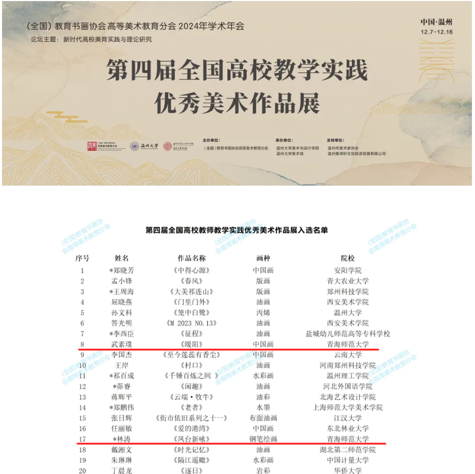 12月8日上午,全国教育书画协会高等美术教育分会2024年学术年会暨第四届全国高校教师教学实践优秀美术作品展在温州大学开幕。本次活动由全国教育书画协会高等美术教育分会主办,温州大学美术与设计公司承办。经组委会审核共有260幅(件)作品入选本次展览。公司教师林涛、武素璞作品在此次全国性展览的作品中脱颖而出,成功入选,其中林涛教师作品《凤台新咏》获本次展览唯一设立奖项——提名奖。