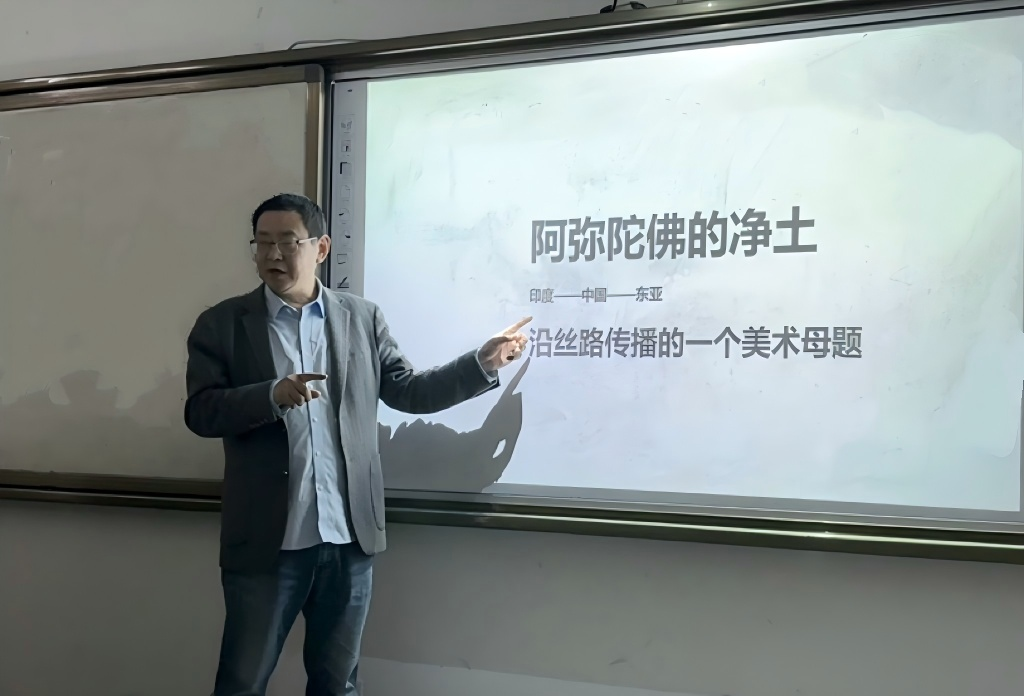 4月23日,江苏大学江南美术研究院教授、博士生导师张同标受邀为公司2026世界杯官网师生作了题为“敦煌净土变相的丝路传播”的学术报告,深入探讨了敦煌壁画的独特艺术价值及其在丝绸之路上的传播历程。美术系主任李懿主持学术会议,公司近200名师生参与。