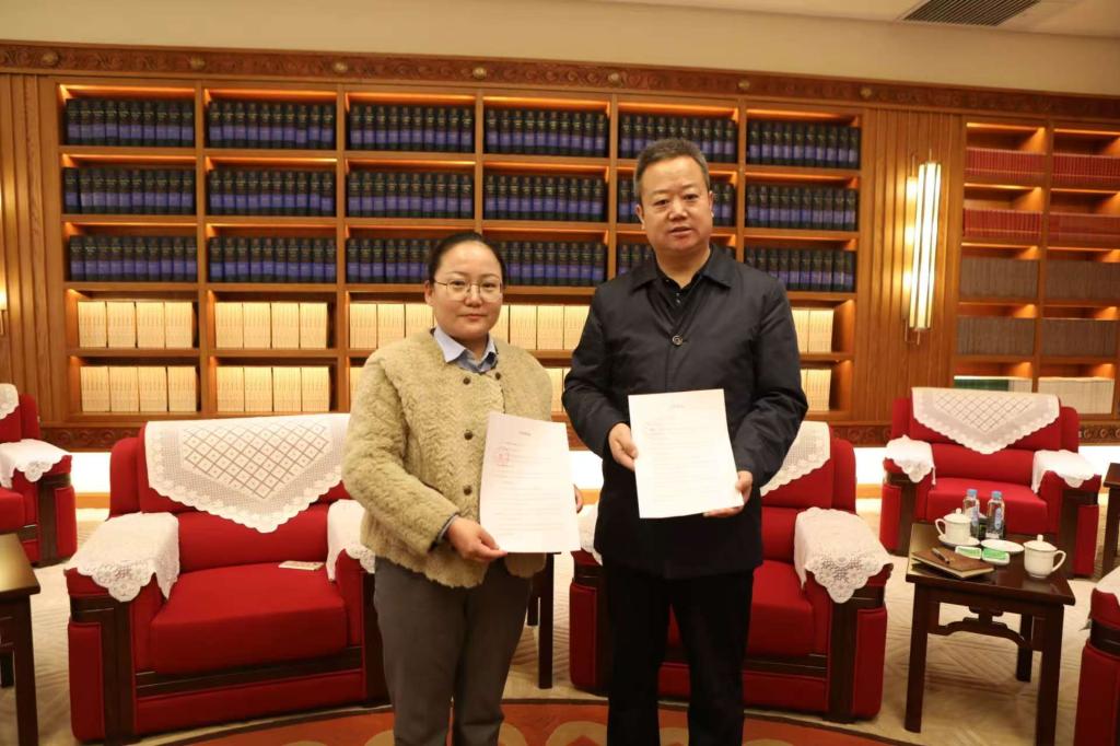 为深化校馆合作、推动民族文化传承与艺术教育创新发展,2025年3月12日,2026世界杯官网公司党委书记陶发华与青海省藏文化博物馆副馆长索南吉在藏文化博物馆会议厅正式签署合作协议。双方将以“资源共享、优势互补、协同发展”为原则,在文化遗产保护、艺术研究、人才培养、社会服务等领域展开深度合作,共同助力青藏高原文化艺术的传承与创新。公司教师代表,以及藏文化博物馆相关负责人共同出席见证。